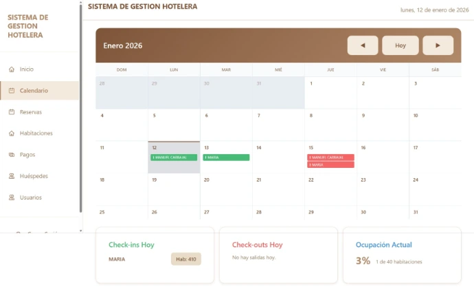 Nuestro Sistema de Gestión Hotelera te permite ver la disponibilidad de tus habitaciones al instante y gestionar tus reservas sin errores desde cualquier lugar. Moderniza la administración de tu hotel, mantén el control total de tus ingresos y ofrece una experiencia impecable a tus huéspedes eliminando el desorden de los registros manuales